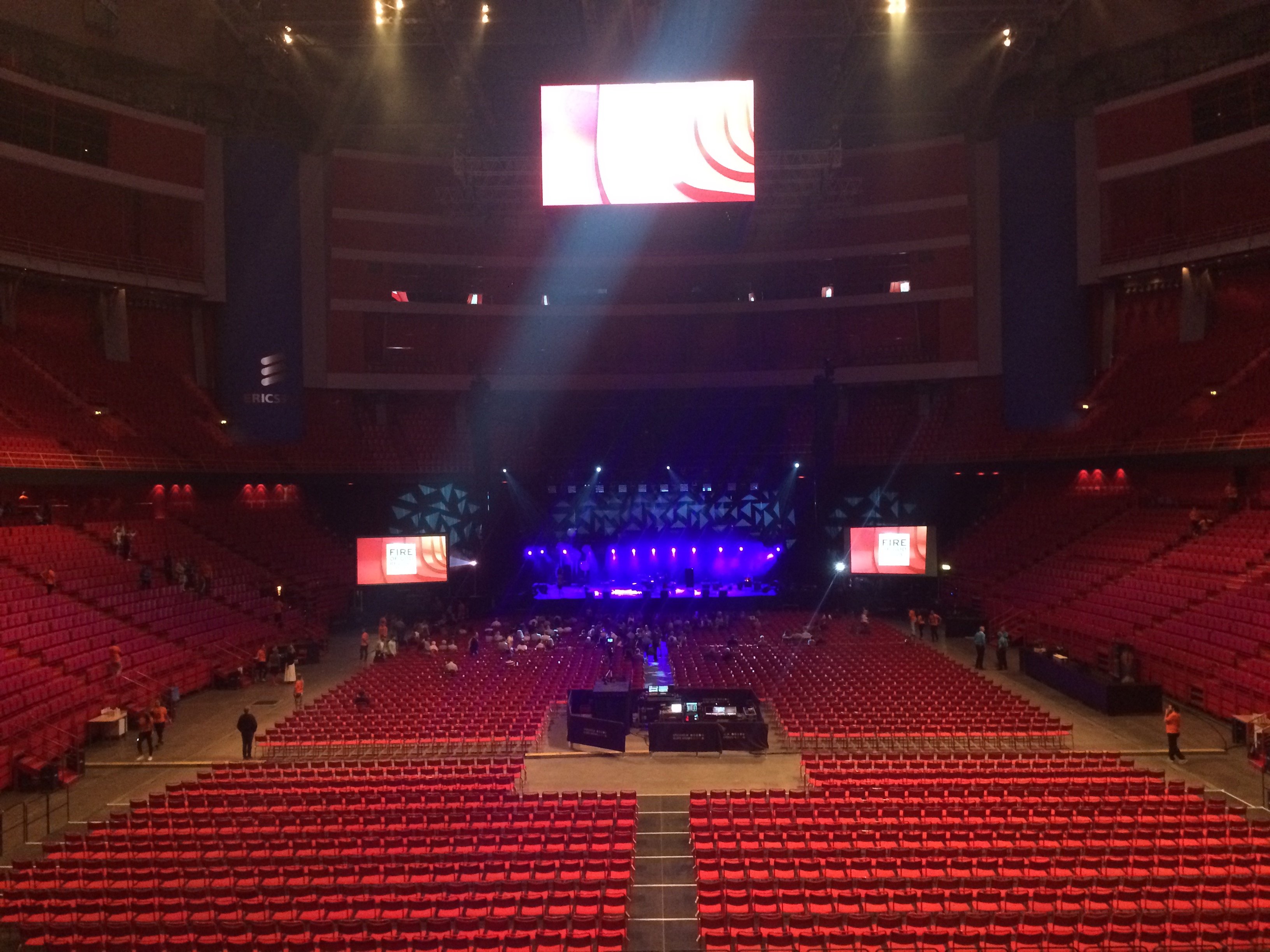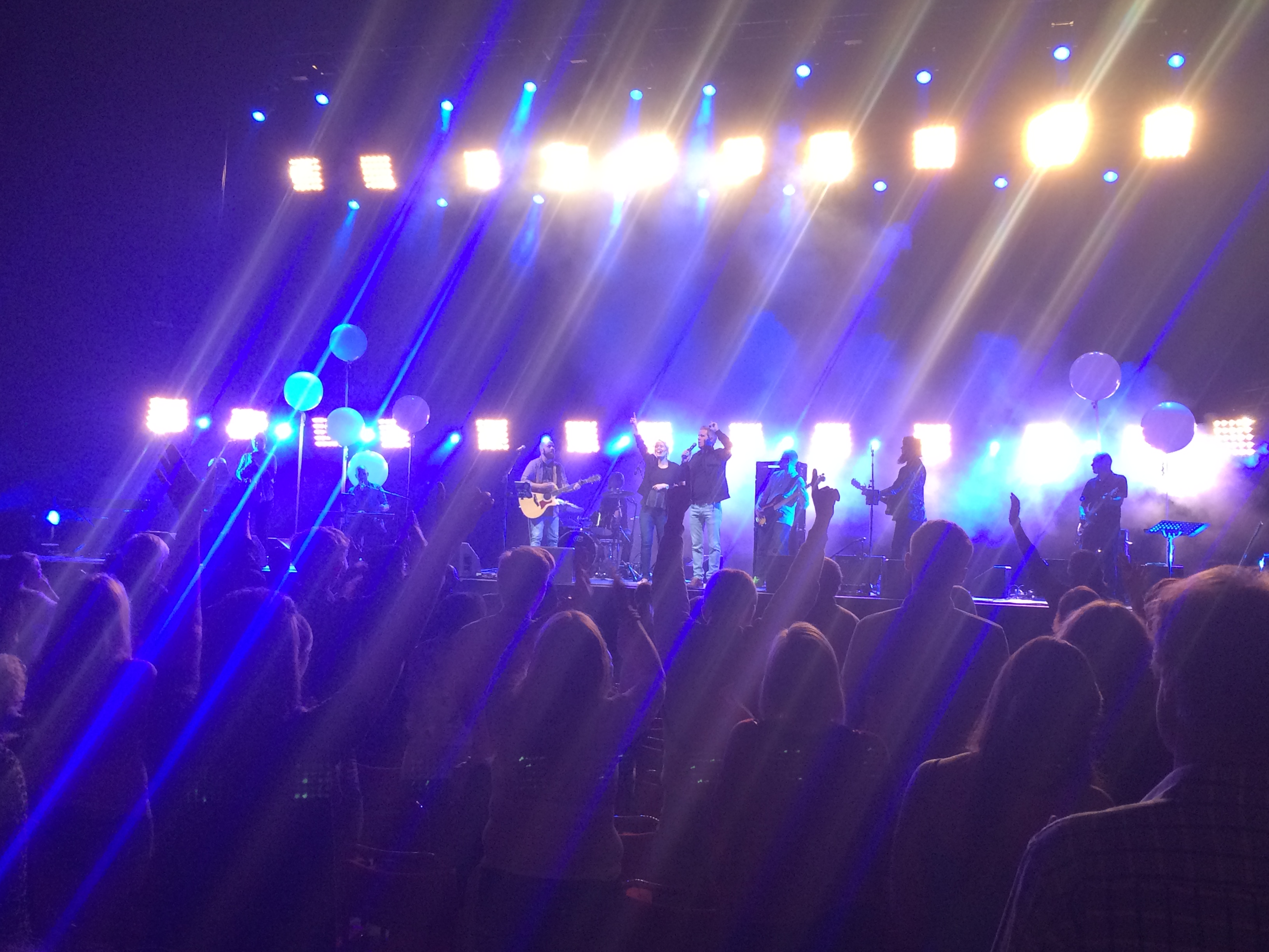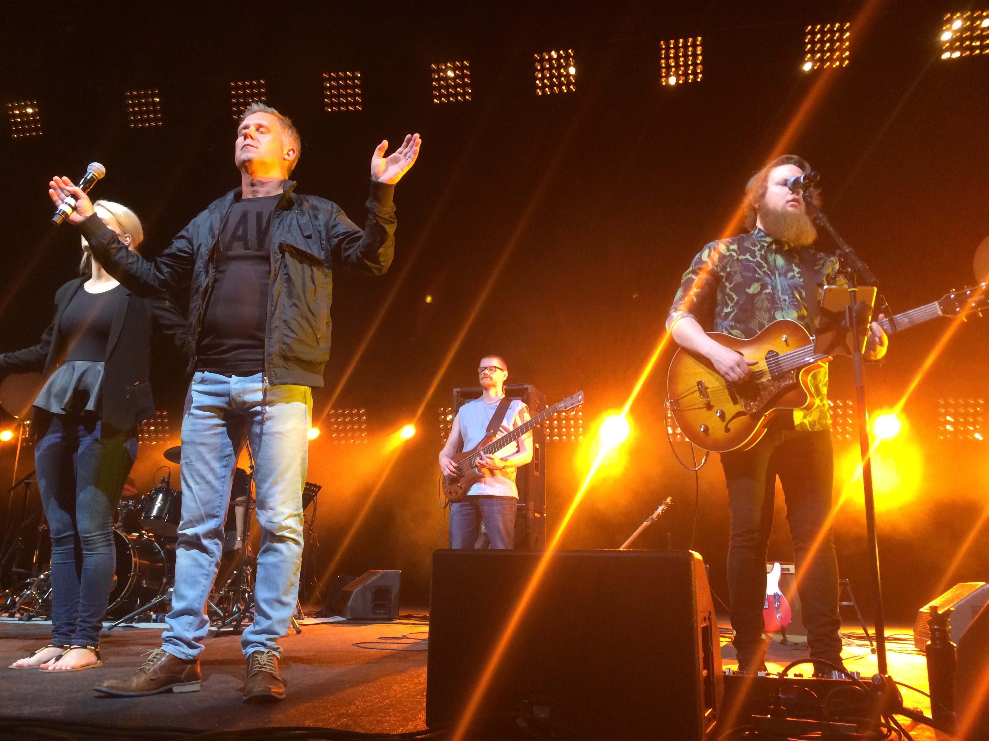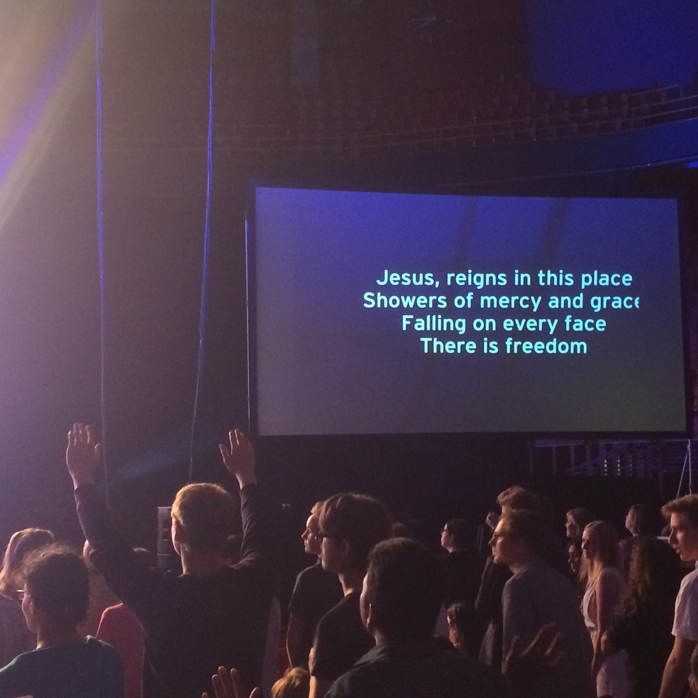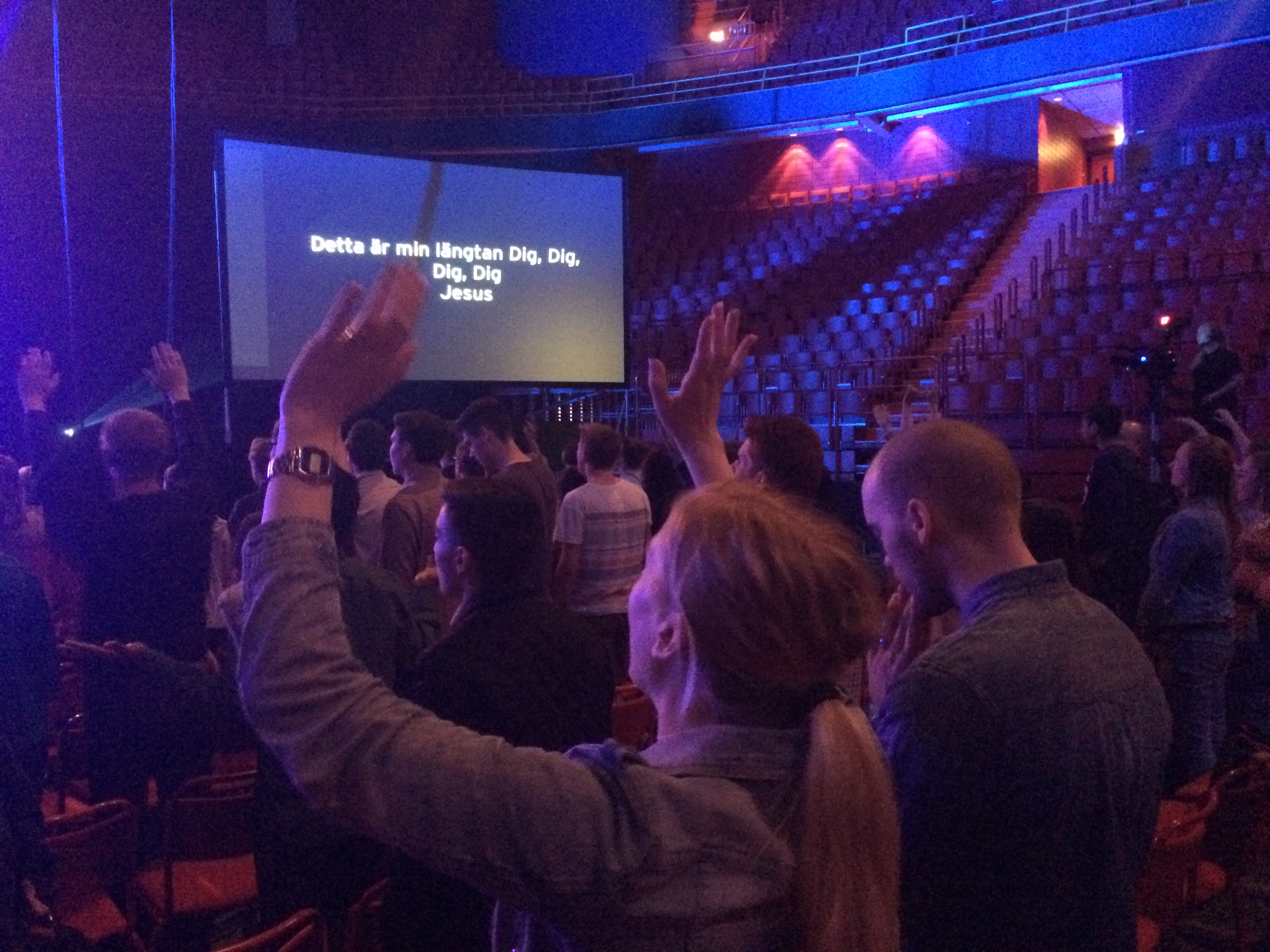 Predikanterna går av scenen och ett sju medlemmar starkt band tar vid. En sirlig Coldplay-känsla infinner sig. Några spontana Hosianna-wailningar från en tjej till höger om mig medan texterna tar plats på gigantiska bildskärmar. ”Jesus reigns in this place. Showers of mercy and grace”. Sedan börjar det eskalera. Händer utan spretande lill- och pekfingrar höjs upp i luften och starka röster ljuder. – Hosianna!!! – Han är härlig! – Ja, han är härlig. Jag försöker sjunga med i texterna. Vid ett par tillfällen får jag lite feeling och drar till med några stämmor, men någon ande i mig bedömer jag inte att jag känner. Det verkar de flesta andra göra.