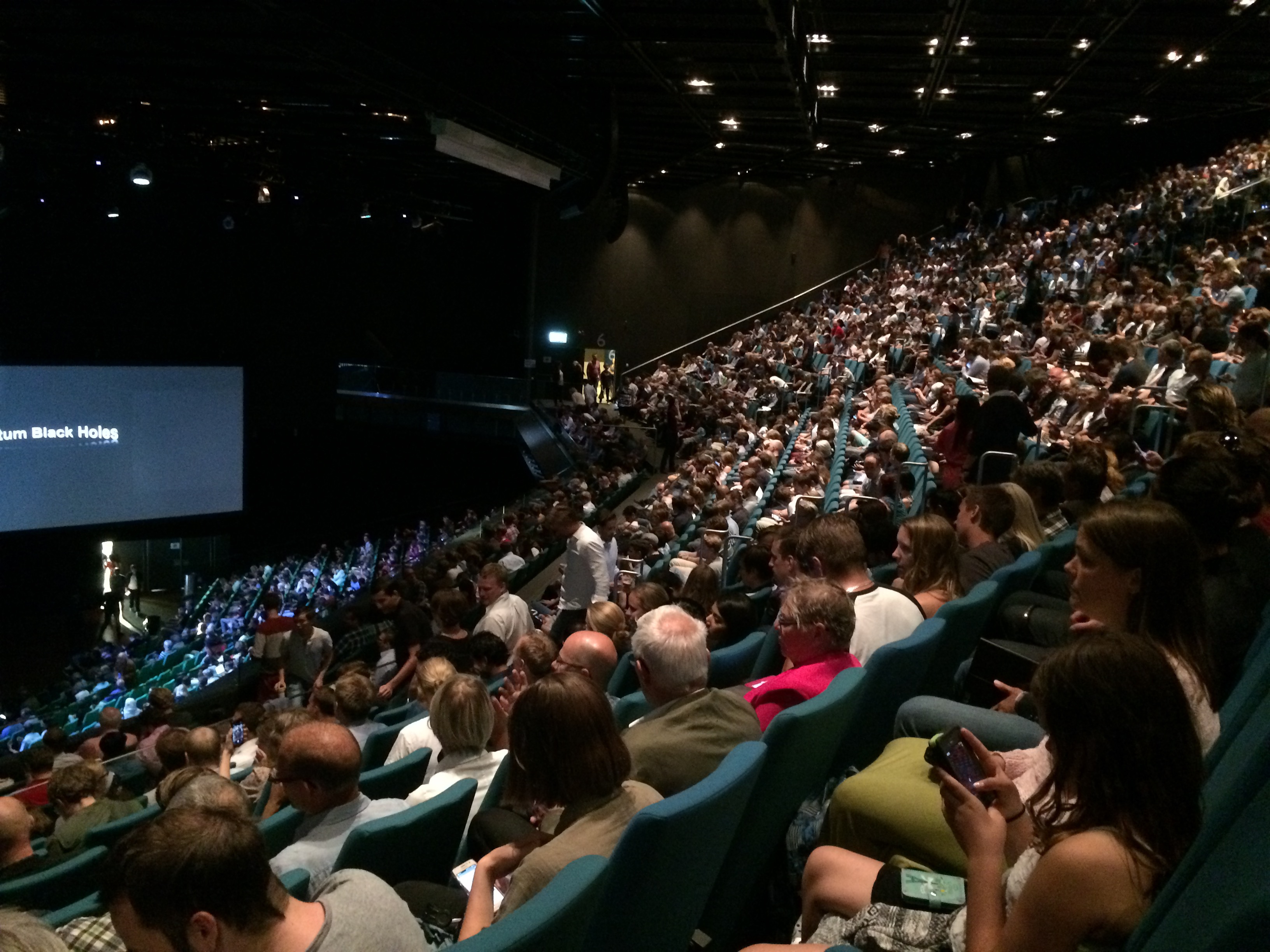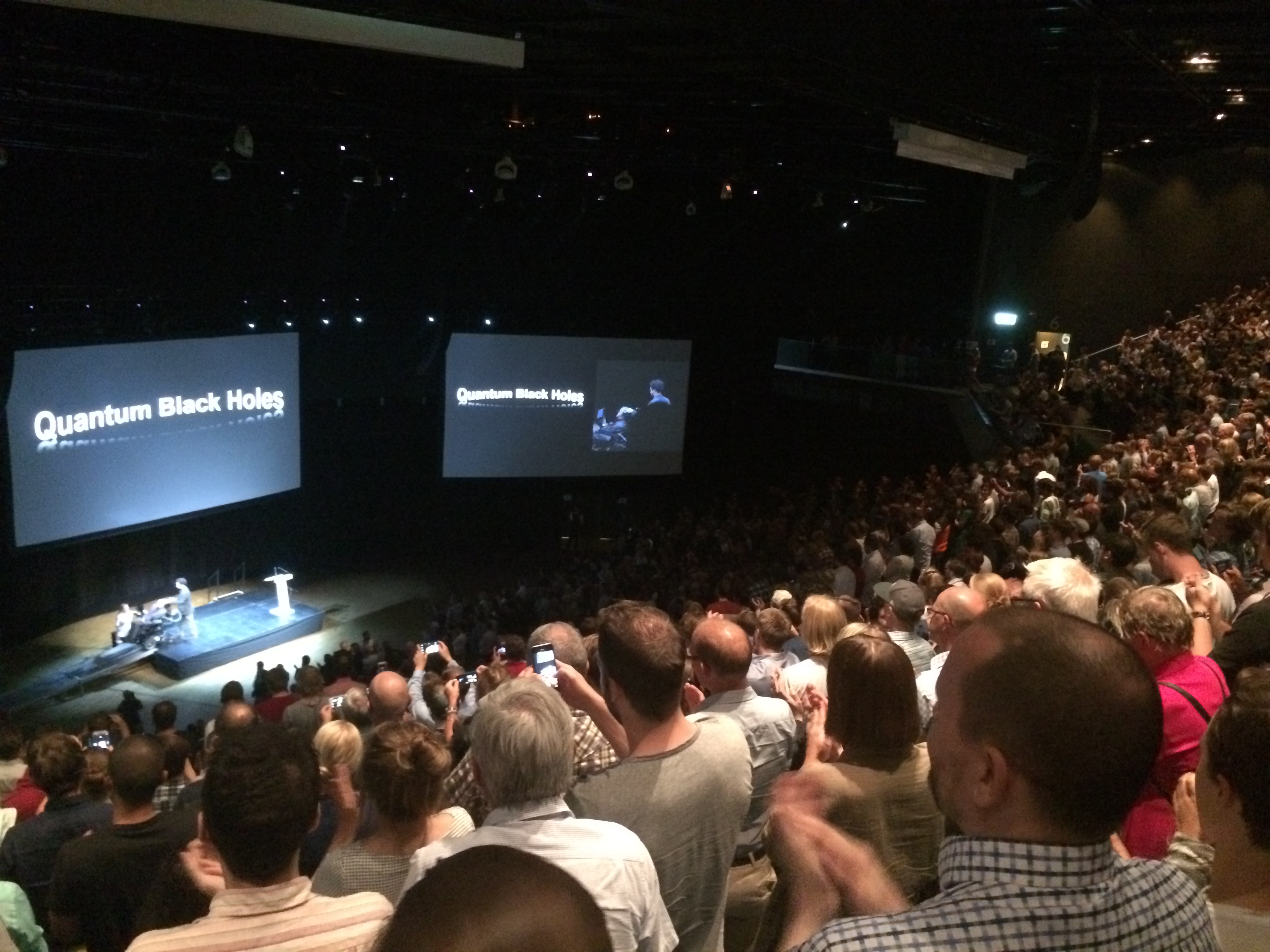 Tillställningen är antitesen till ett fotbollsderby men förmodligen så nära en rockkonsert man kommer inom fysiken. Blandade åldrar, vördnadsfullt och alkoholfritt men också dånande applåder och jubel. Dr Hawking introduceras via ett inspelat anförande av excentriske Dr Sheldon Lee Cooper, rollfiguren från The Big Bang Theory som väl är fysikens just nu största TV-stjärna (spelas av Jim Parsons). Det är mycket roligt. Dock inte särskilt oväntat då Hawking ständigt flörtar med populärkulturen. Han har bland annat medverkat i The Simpsons.